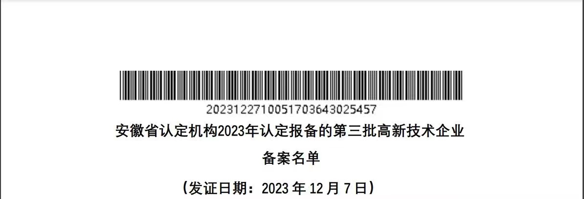 安徽中鲸科技有限公司(以下简称:中鲸科技)通过2023年度高新技术企业(证书编号:G R202334007456)认定,公告如下: